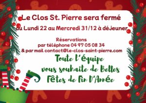 Fermeture de Noël du lundi 22 au mercredi 31 décembre à déjeuner