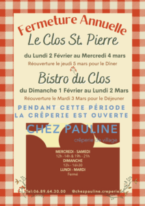Fermeture de Noël du lundi 22 au mercredi 31 décembre à déjeuner